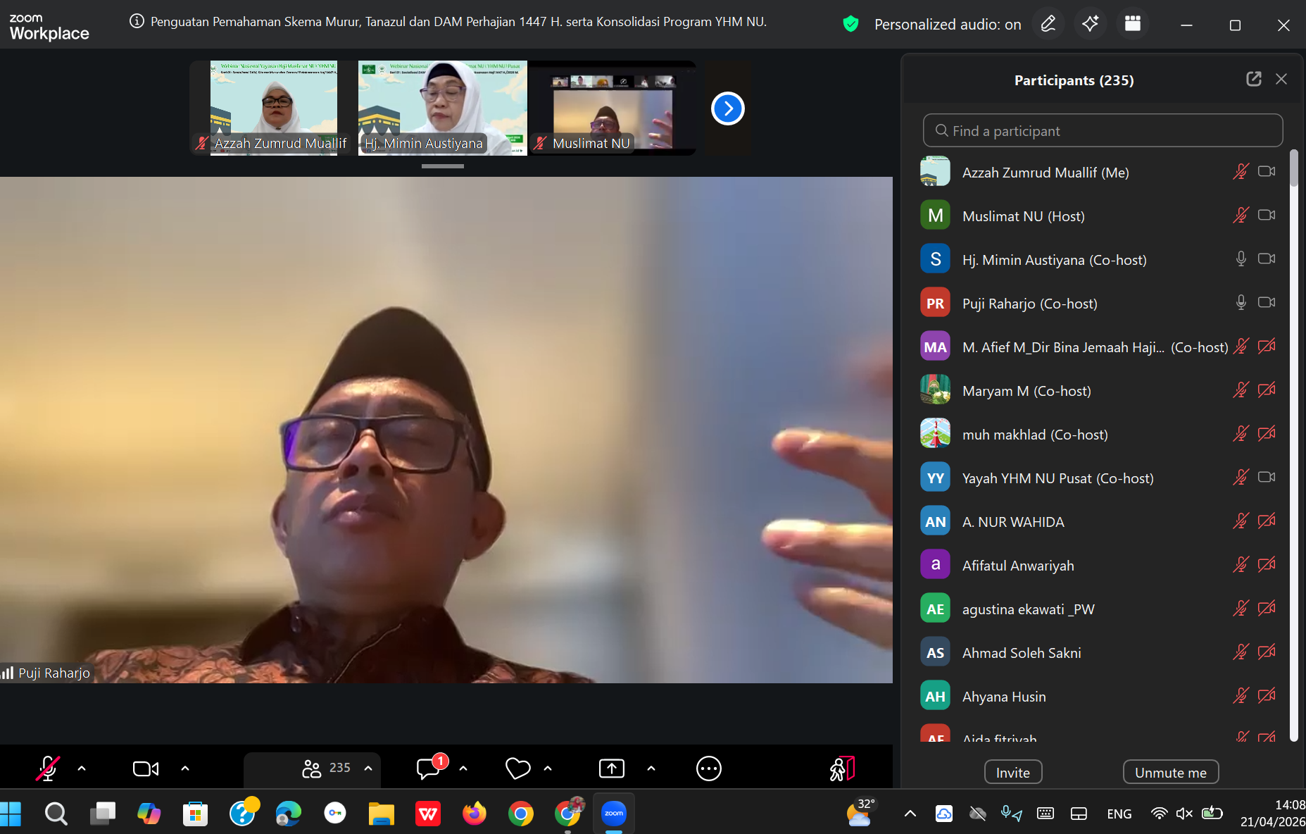 Hadir sebagai narasumber utama, Direktur Direktorat Jenderal Kementerian Haji RI KH.Dr. Puji Raharjo yang memberikan pemaparan komprehensif terkait kebijakan dan teknis pelaksanaan ibadah haji tahun 1447 H/2026 M. Materi yang disampaikan mencakup pemahaman tentang DAM (denda dalam ibadah haji), serta skema murur dan tanazul yang menjadi bagian penting dalam manajemen pergerakan jamaah di Arafah, Muzdalifah, dan Mina (Armuzna). “Penjelasan ini diharapkan mampu memberikan pemahaman yang utuh kepada jamaah, sehingga dapat menjalankan ibadah dengan tertib, sah, dan sesuai ketentuan syariat.” imbuh moderator acara Hj. Mimin Austiana Ketua-II YHM NU Pusat.